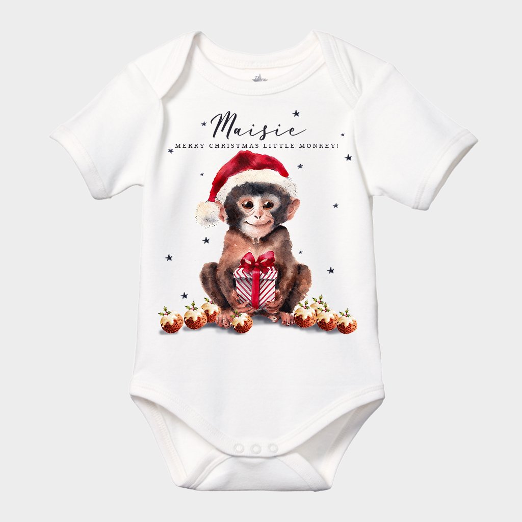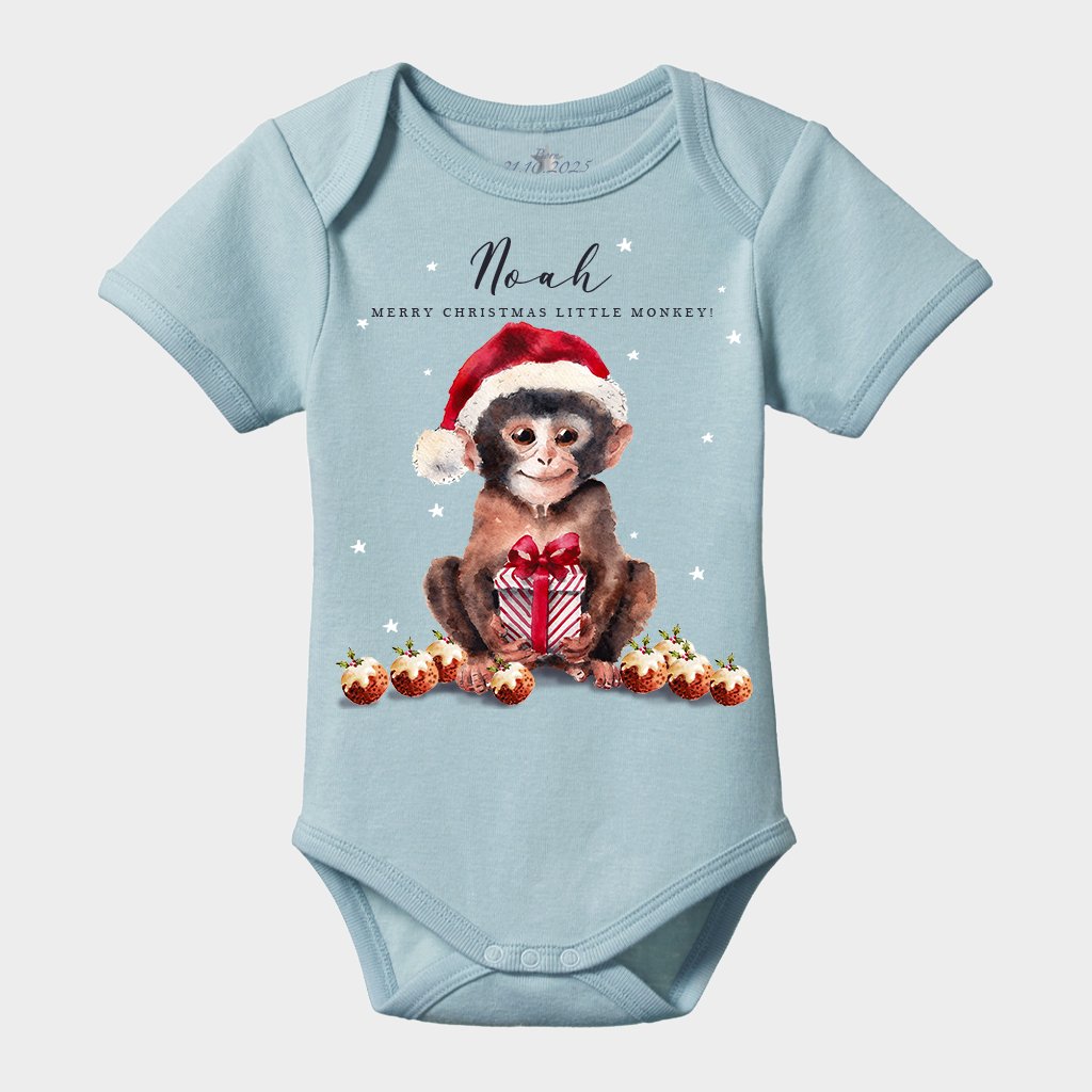 Celebrate the season with this personalised organic cotton bodysuit, featuring a hand-painted monkey celebrating Christmas with Christmas puddings. Finished with your baby’s name and “MERRY CHRISTMAS LITTLE MONKEY” written below, it’s the perfect festive outfit or keepsake gift. Soft, eco-friendly and handmade with love.