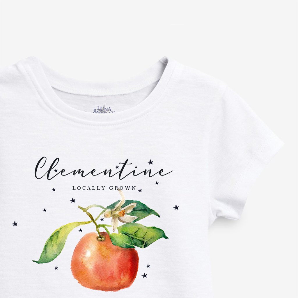 This personalised kids T-shirt features a beautiful hand-painted watercolour clementine design, finished with cute wording “locally grown” beneath your child’s name. A lovely choice for kids named Clementine-but just as perfect for little ones whose parents simply love something sweet, fresh and individual!