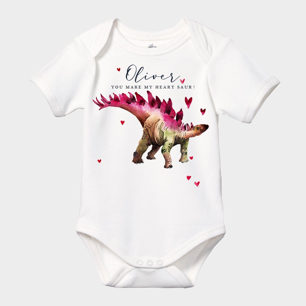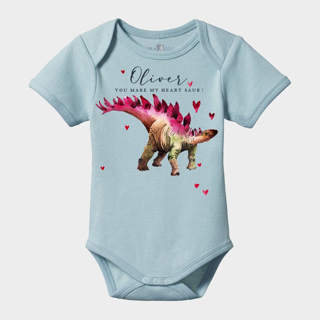 On the chest is a beautiful hand painted watercolour print of a Valentine dinosaur surrounded by love hearts. Baby’s name is incorporated into artwork with wording “YOU MAKE MY HEART SAUR!” written below. Inside the back neck is a print of the date of birth of the baby.