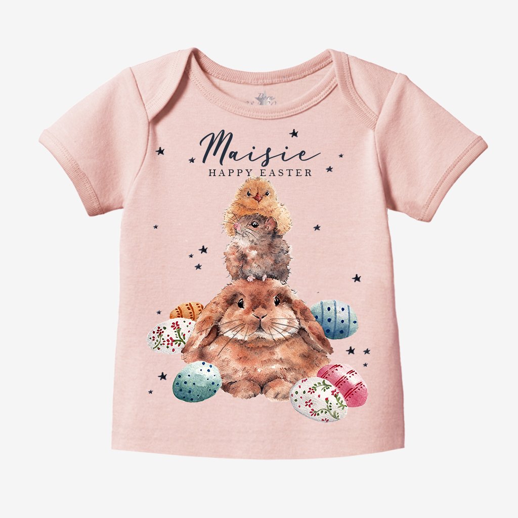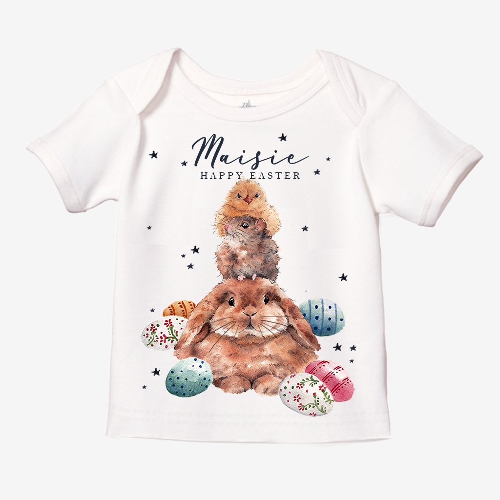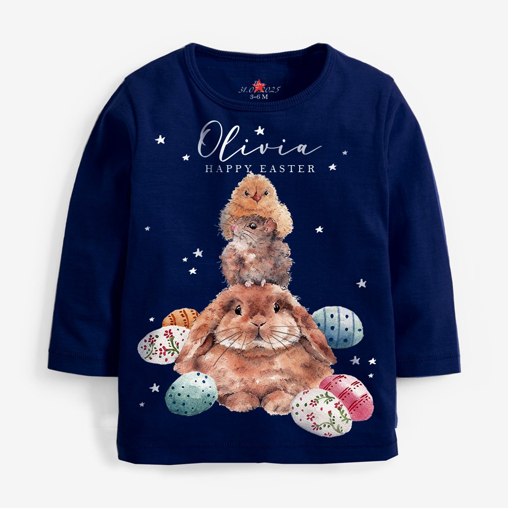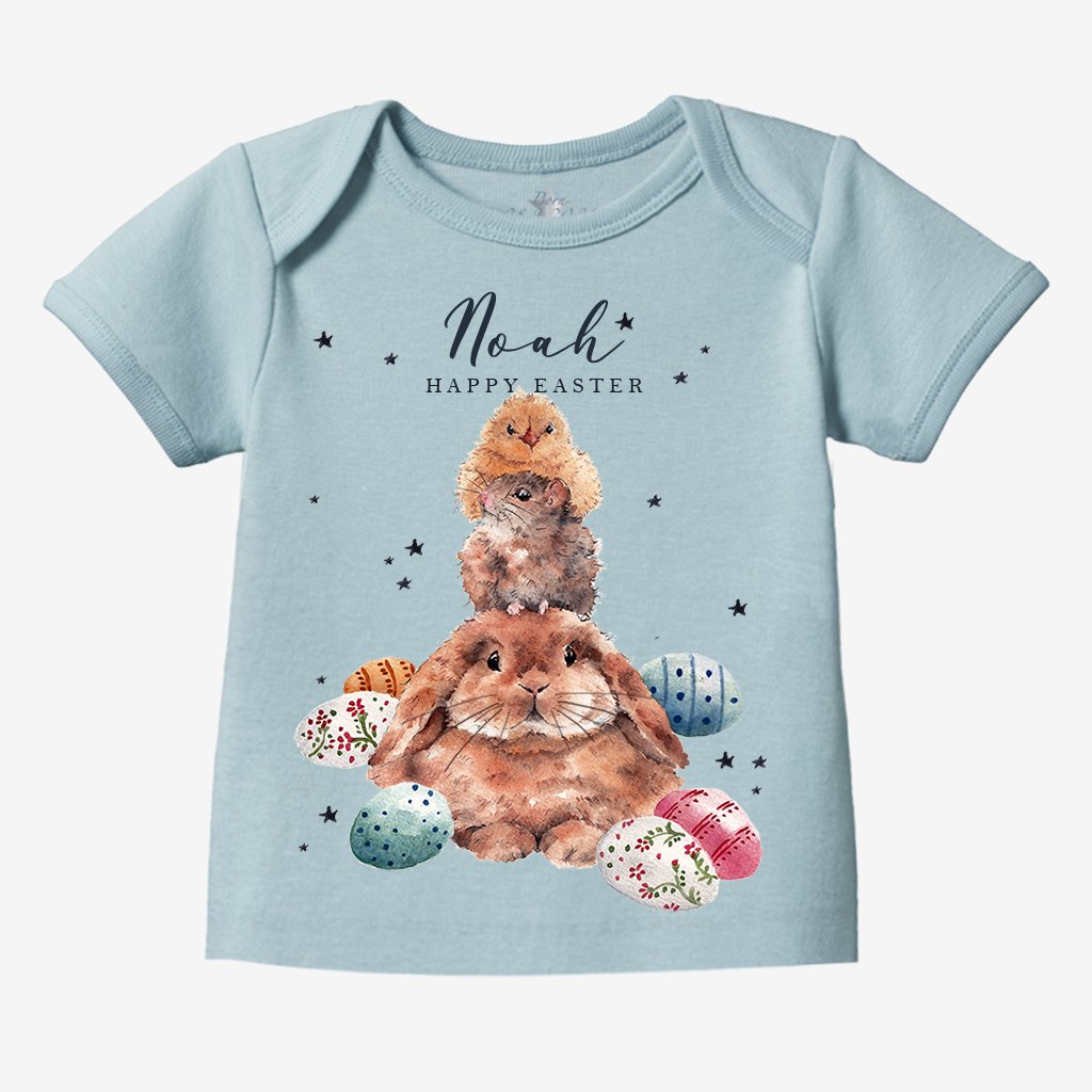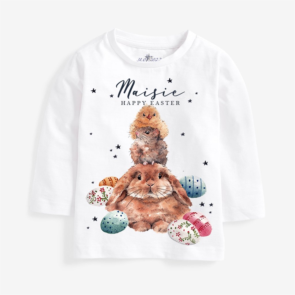 This personalised baby Easter Bunny kids T-shirt, features an original hand-painted watercolour design of an Easter bunny with a field mouse perched on top and a duckling sat above, surrounded by colourful Easter eggs. The design is finished with your baby’s name and the wording “HAPPY EASTER” written below and baby’s date of birth printed discreetly inside the back neck, creating a truly special keepsake.
