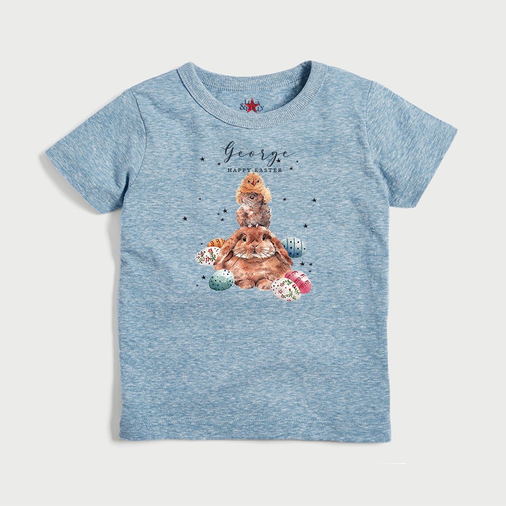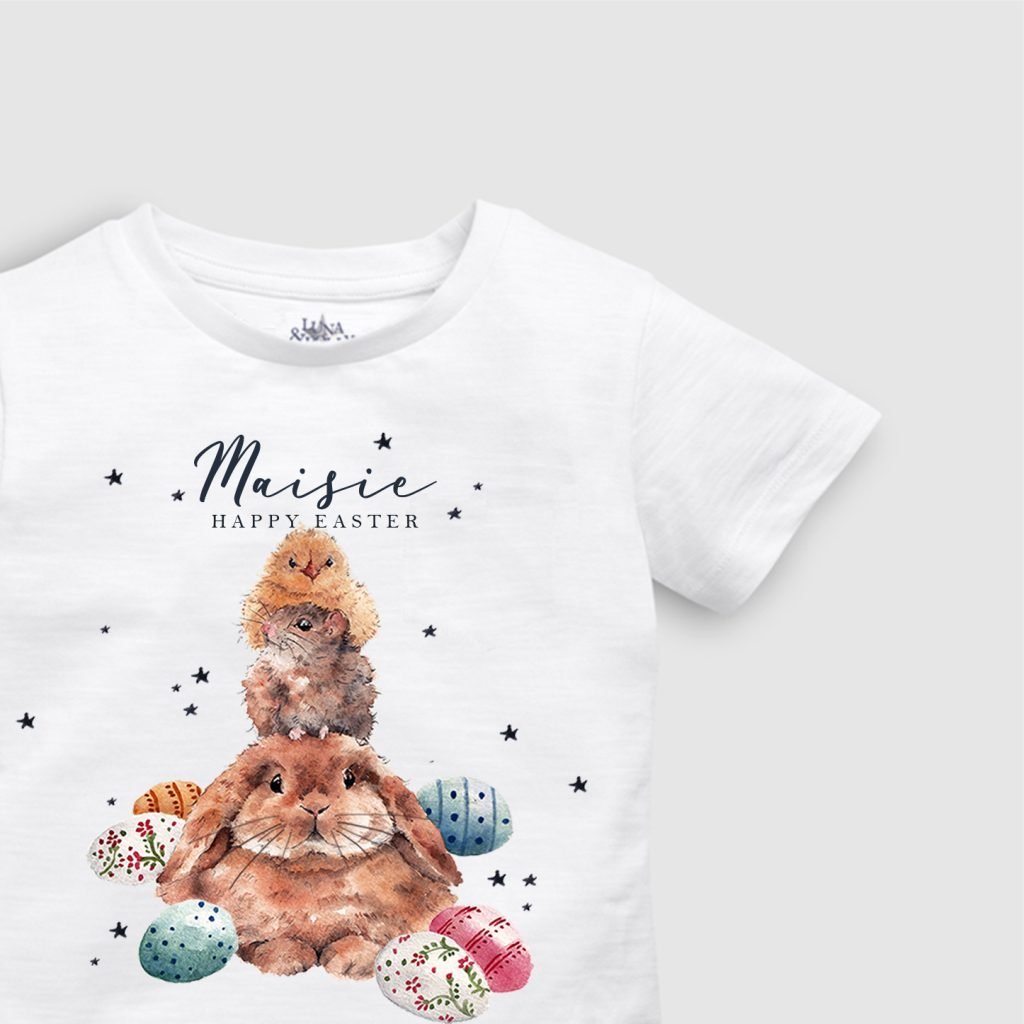 This personalised kids Easter Bunny kids T-shirt, features an original hand-painted watercolour design of an Easter bunny with a field mouse perched on top and a duckling sat above, surrounded by colourful Easter eggs. The design is finished with your child’s name and the wording “HAPPY EASTER” written below, creating a truly special keepsake.