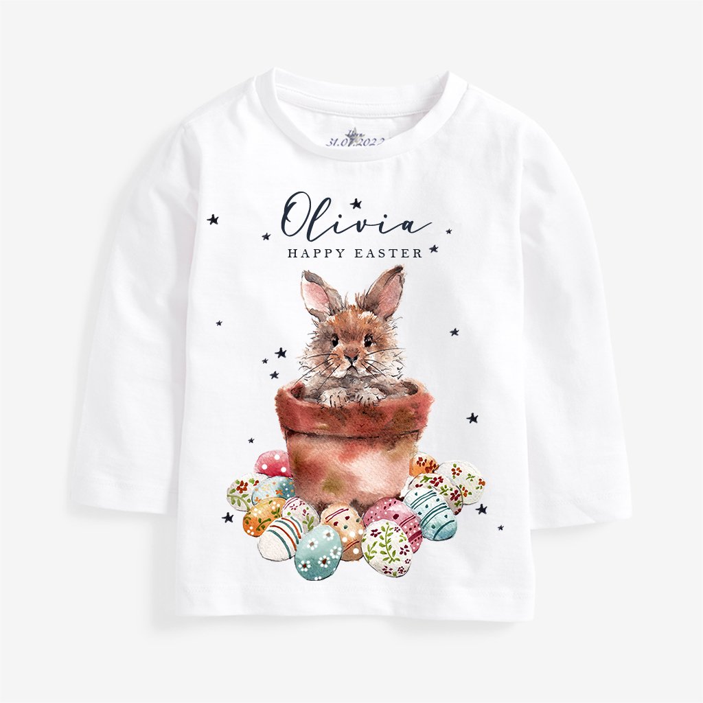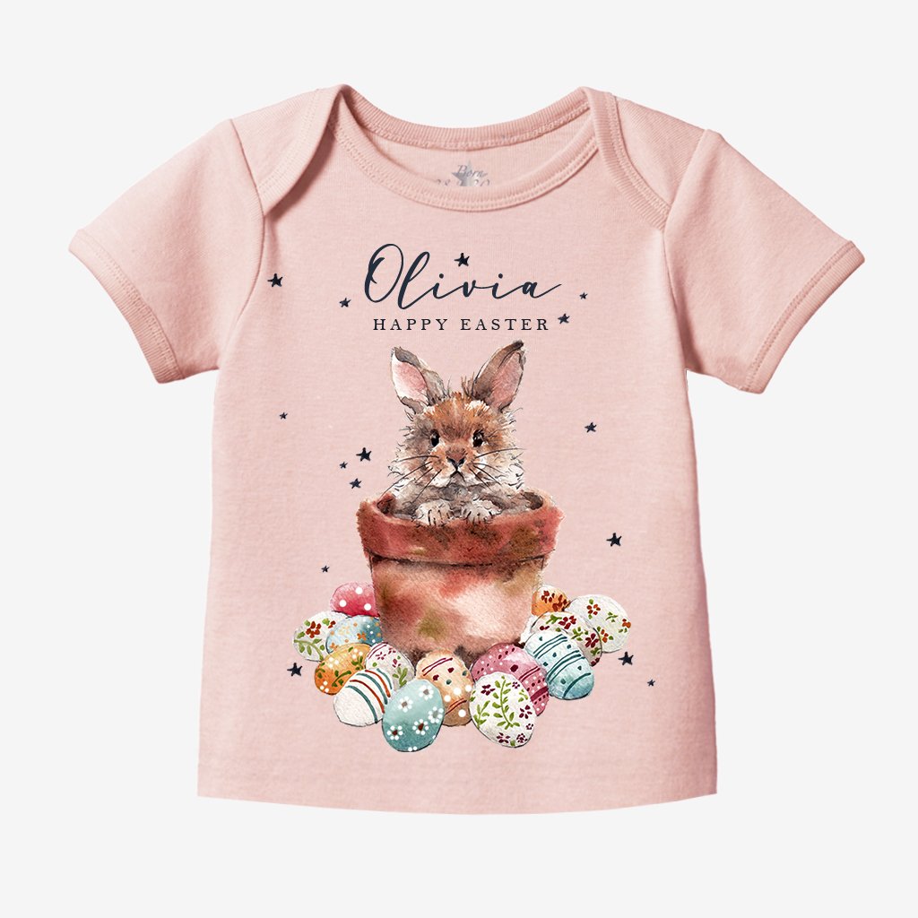 Celebrate your little one’s first Easter in the sweetest way with this personalised baby Easter T – shirt, featuring an original hand-painted watercolour of a baby Easter bunny peeking out of a plant pot, surrounded by colourful Easter eggs. The design is finished with your child’s name and the wording “HAPPY EASTER” written below, creating a truly special keepsake.