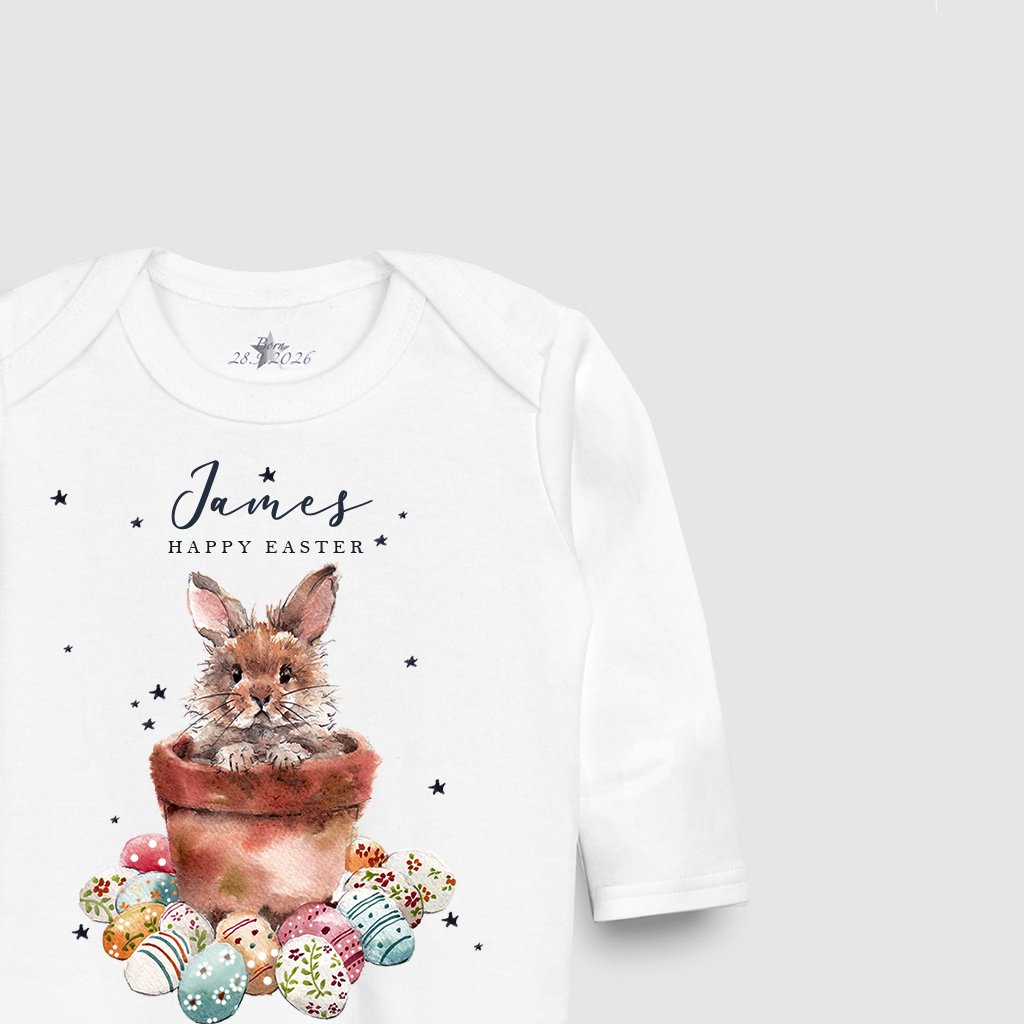 Celebrate your little one’s first Easter in the sweetest way with this personalised baby Easter sleepsuit, featuring an original hand-painted watercolour of a baby Easter bunny peeking out of a plant pot, surrounded by colourful Easter eggs. The design is finished with your child’s name and the wording “HAPPY EASTER” written below, creating a truly special keepsake.