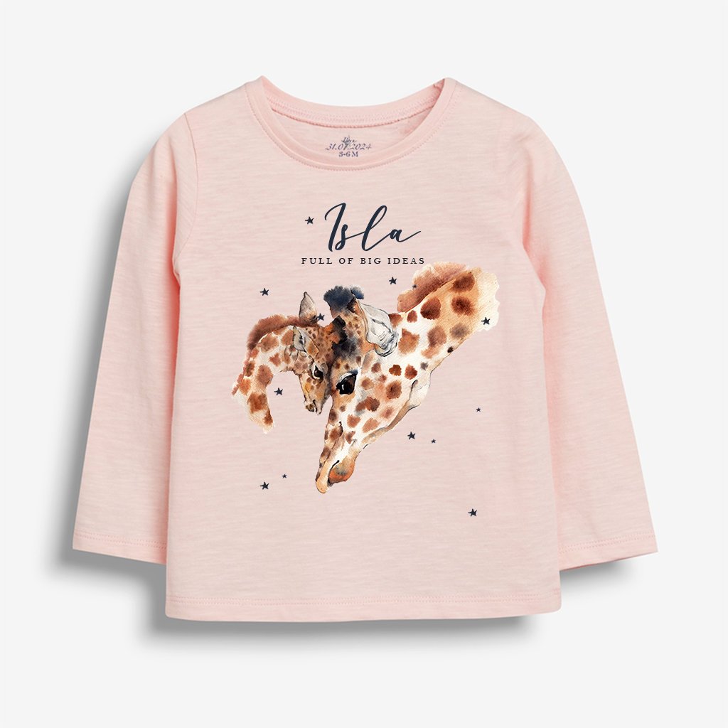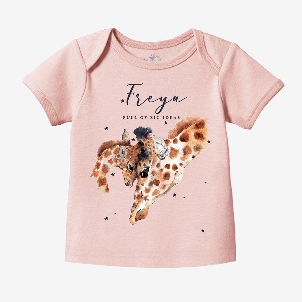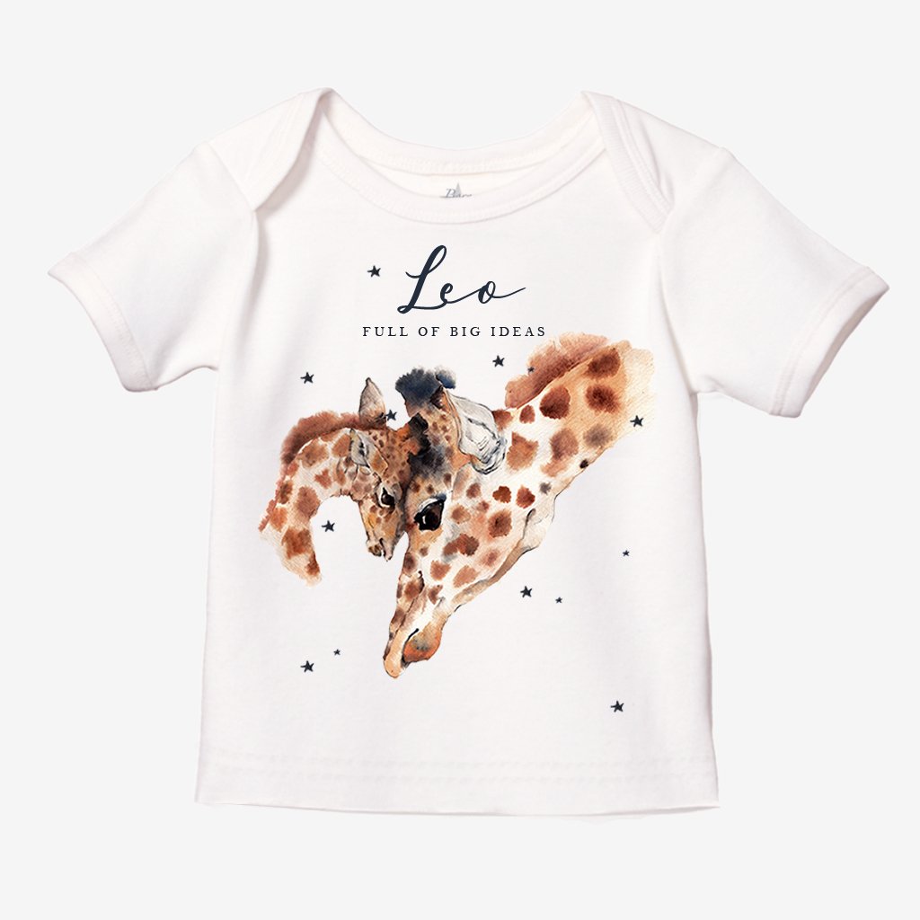 This personalised baby T-shirt features a tender hand-painted watercolour of an adult giraffe gently kissing their baby, finished with the cute wording “full of big ideas” beneath your child’s name. A meaningful design celebrating love, growth and curiosity, it makes a beautiful keepsake for little ones! Baby’s date of birth is also printed inside back neck making it a truly unique gift.