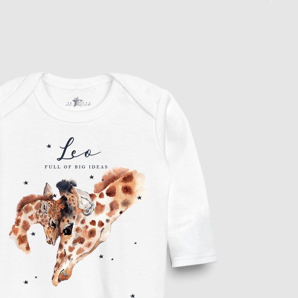 This personalised baby sleepsuit features a tender hand-painted watercolour of an adult giraffe gently kissing their baby, finished with the cute wording “full of big ideas” beneath your child’s name. A meaningful design celebrating love, growth and curiosity, it makes a beautiful keepsake for little ones with baby’s birth date printed inside the back neck.