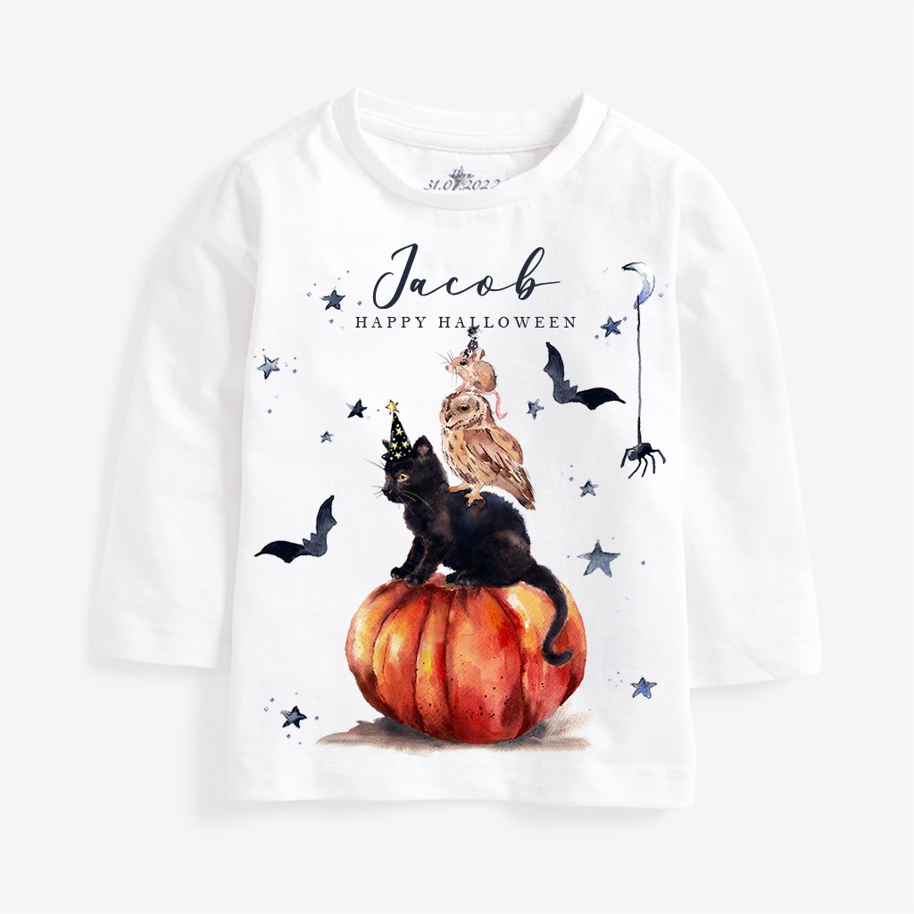Celebrate spooky season in style with our personalised Halloween T-Shirt, featuring a magical black cat perched on a pumpkin, an owl and a tiny mouse-with bats and a friendly spider completing the scene.
