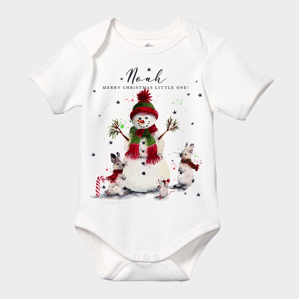Bring a festive cheer to your baby’s first Christmas with this personalised organic cotton Christmas bodysuit featuring a hand-painted snowman and snow bunnies. Each design is lovingly created by hand and printed on the softest 100% organic cotton, making it gentle on delicate skin and eco friendly.